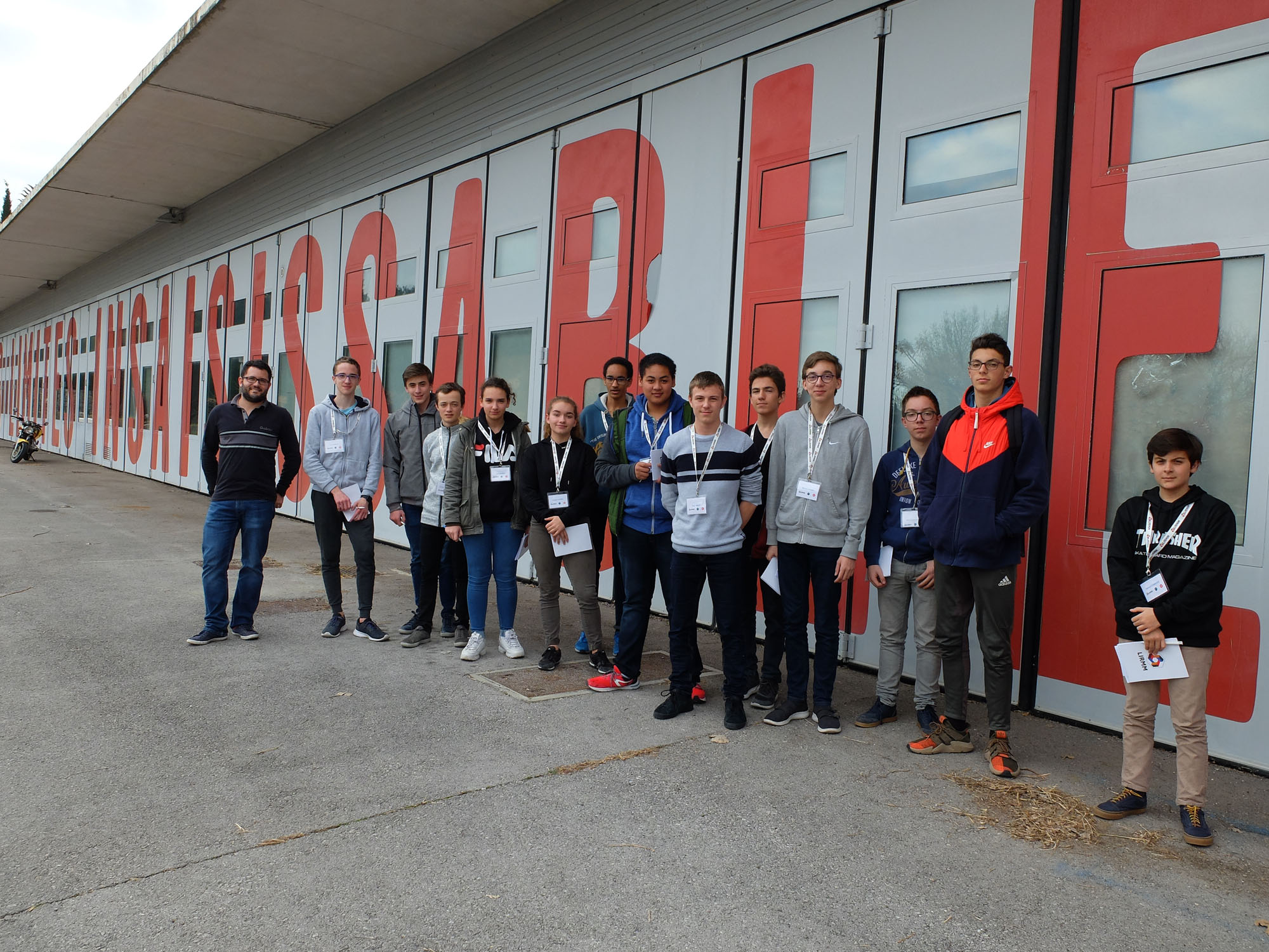 Photo : Florent Bruguier et les stagiaires des collèges Joffre, François Villon, Max Rouquette, Croix d’Argent, du lycée Jean Jaurès et de l’institution Sévigné devant le bâtiment du pôle CNFM de Montpellier